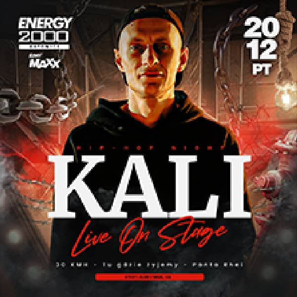 W piątek 20.12 zapraszamy na kolejną imprezę z cyklu HIP-HOP NIGHT. Na scenie pojawi się KALI! Autor hitów: "Igristoje", "Tam gdzie Ty", "Miasto Boga" "Opary", "30 KMH", "Wstawaj", "Mona Lisa" i wiele innych . Tego wydarzenia naprawdę nie możecie przegapić.