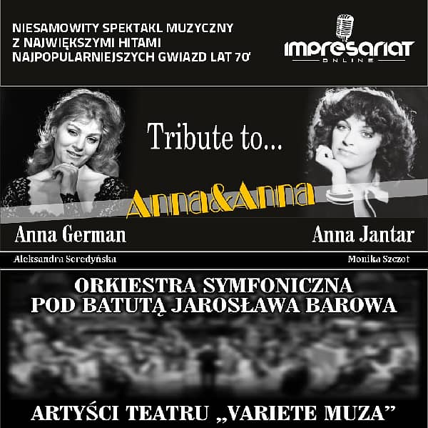 Znane i lubiane, a zarazem nowocześnie zaaranżowane i ciekawie zaśpiewane piosenki największych osobowości polskiej estrady, czyli Anny German i Anny Jantar, tworzą niesamowity spektakl muzyczny "Anna & Anna"Warto podkreślić oryginalną formę sceniczną tego wydarzenia nazwaną przez realizatorów "koncertem fabularyzowanym", którego reżyserem jest słynny kompozytor i dyrygent - Jarosław BARÓW, który będzie towarzyszył artystkom wraz z orkiestrą koszalińskiego Teatru Variete Muza. Chociaż od przedwczesnej śmierci Anny German i Anny Jantar minęło już kilkadziesiąt lat, to fenomen niezwykłej popularności tych artystek wciąż trwa. Na scenie udało się odtworzyć klimat lat siedemdziesiątych widoczny zarówno w tematycznej scenografii, jak i w strojach czy stylowych fryzurach bohaterek. Ze scenicznych, ciekawie skomponowanych dialogów wyłoniły się bardziej i mniej znane fragmenty biografii polskich artystek.Pomiędzy kultowymi piosenkami, takimi jak Staruszek świat, Tańczące Eurydytki, Jambajaya, Człowieczy los, Moje największe marzenie, czy Za każdy uśmiech Twój, poznamy nie tylko ich wspomnienia i historię artystycznych sukcesów, ale także marzenia i plany, które - niestety, nigdy nie zostały zrealizowane... Teraz pozostały zdjęcia, wspomnienia i piosenki, których wciąż nowe pokolenia słuchają z jednakową przyjemnością. Ten koncert na stałe odciśnie swoje piętno w historii polskiej estrady.