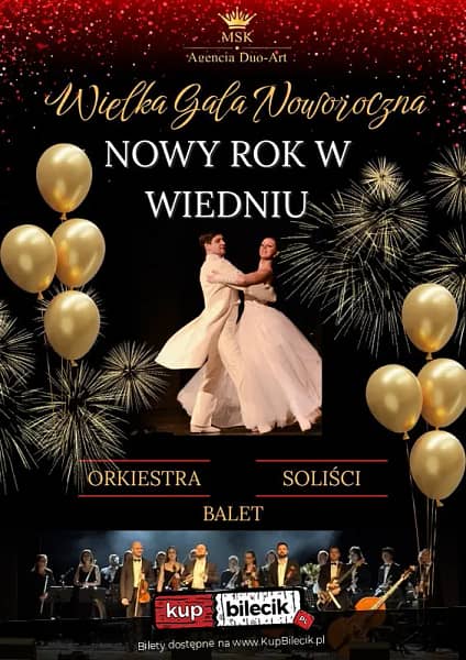 Wielka Gala Noworoczna 2026 - "Nowy Rok w Wiedniu". Już teraz pragniemy zaprosić Państwa w magiczną, karnawałową podróż do roztańczonego Wiednia! Podczas tego dwuczęściowego koncertu zaprezentowane zostaną dystyngowane walce, gorące czardasze, najpiękniejsze arie i duety operetkowe oraz wielkie przeboje świata estrady a wszystko to w wykonaniu wybitnych solistów, tancerzy oraz orkiestry. Nasz koncert to połączenie klasycznej wiedeńskiej formy z współczesnymi przebojami, co stanowi gwarancję wspaniałej zabawy i szampańskiego nastroju! Nie może Państwa zabraknąć! Przywitajmy wspólnie Nowy 2026 Rok!