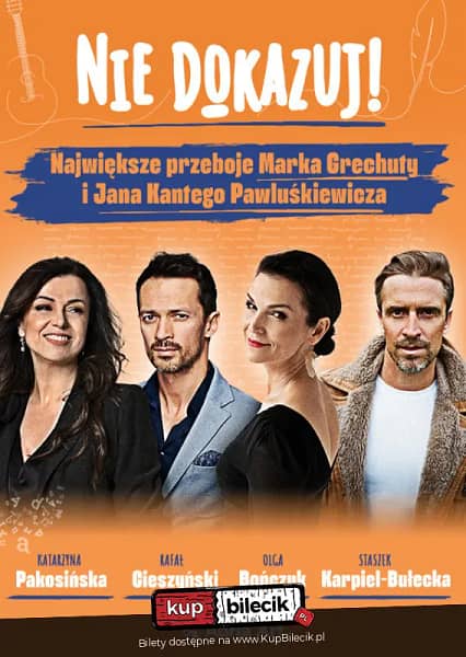 "Nie dokazuj! Największe przeboje Marka Grechuty" to wydarzenie, które łączy muzykę, humor i niezwykłą charyzmę artystów, oferując publiczności niezapomniane emocje. To koncert, który bawi, wzrusza i angażuje - nie przegap tej wyjątkowej okazji, by poczuć magię Grechuty na żywo!